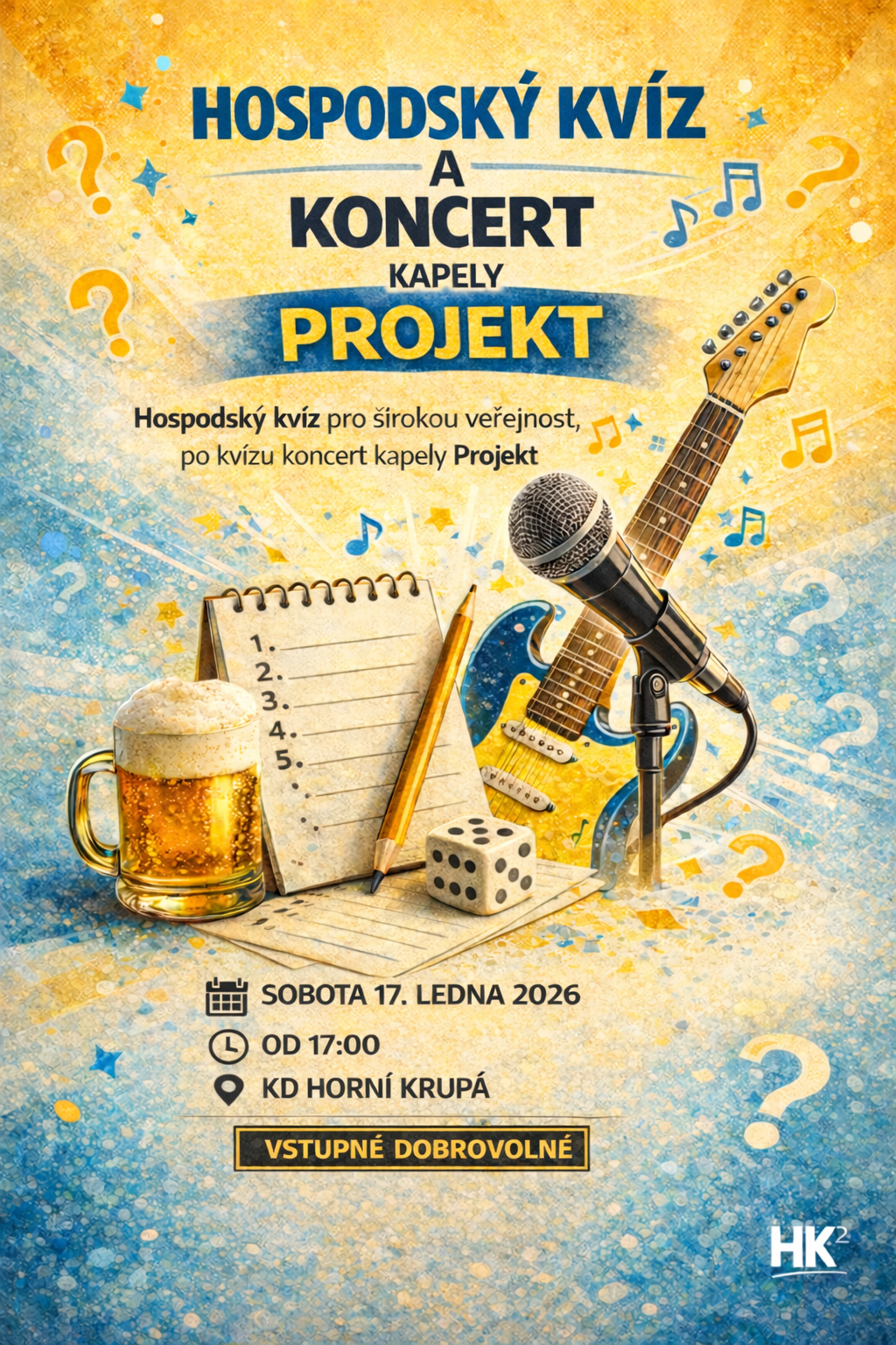 Dne 17.1.2026 od 17 hodin se můžete zúčastnit hospodského kvízu pro čtyřčlenná družstva a po vyhodnocení a debatě následného koncertu. K tanci a poslechu zahraje cca od 19 hodin místní skupina Projekt, hrající převážně rockovou a popovou hudbu.